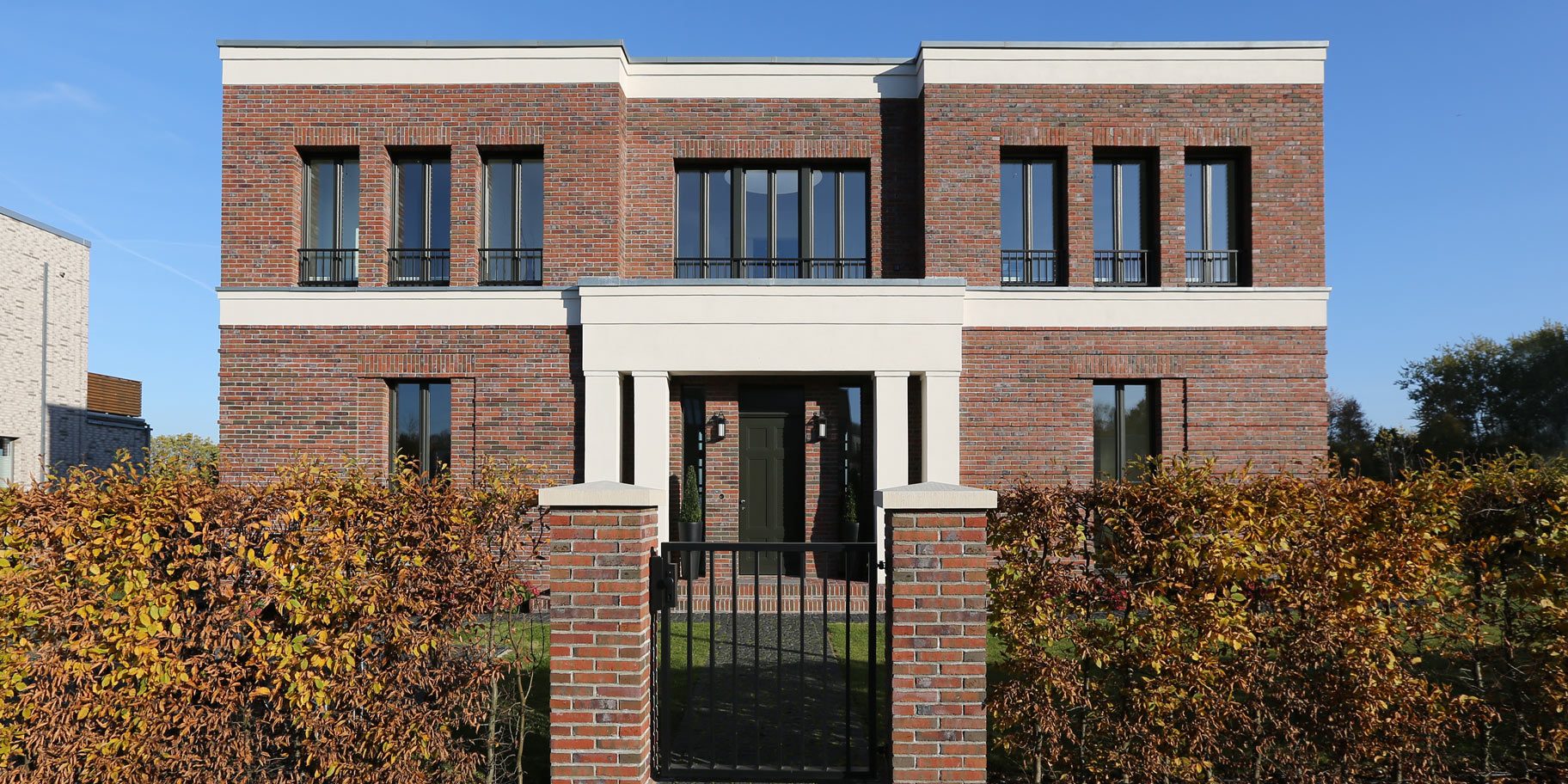 An den regenreichen herbstlichen Tagen des Jahres bietet die raue Wetterschale der Klinkerfassade Schutz und entfaltet jene Gemütlichkeit und Geborgenheit, die ein Backsteinbau seit hunderten von Jahren ausstrahlt. Im Kontrast zum Äußeren sind die Wohnräume im Inneren klassisch modern gestaltet – das Interior der Villa ist insofern von skandinavischen Landhäusern des Klassizismus inspiriert.