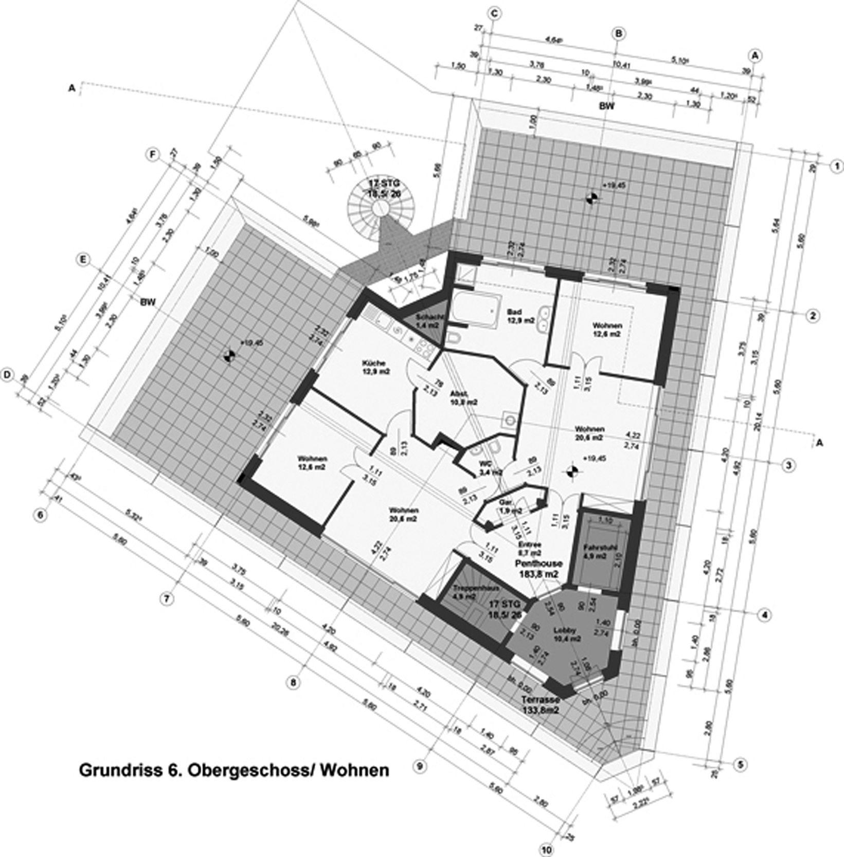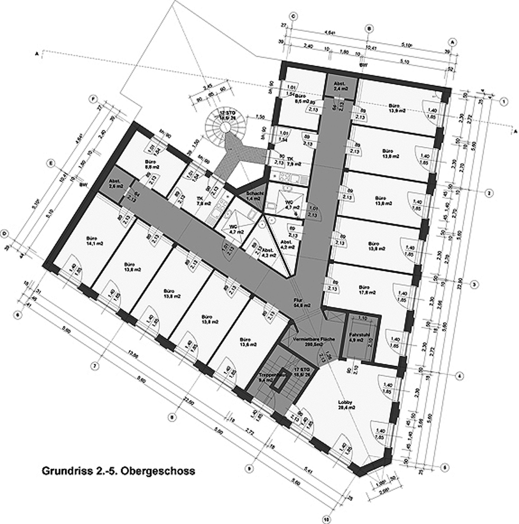 Die Fassaden des Gebäudes bilden ein gleichschenkliges Dreieck und erzeugen eine prägnante Gebäudespitze – hier betritt man auch die sechseckige Lobby des Hauses. Sowohl in funktionaler als auch in konstruktiver Hinsicht bildet die Gebäudespitze das „Rückrat“ des gesamten Hauses. In den jeweiligen Geschossen erwartet den Besucher beim Betreten der Etagenlobby ein faszinierender Blick über den Senefelderplatz bis hin zum Alexanderplatz. Der spitz zulaufende Baukörper entwickelt seine Kubatur konsequent aus der Aufnahme der Baufluchten und der vorgegebenen Traufhöhen der Nachbarschaft.