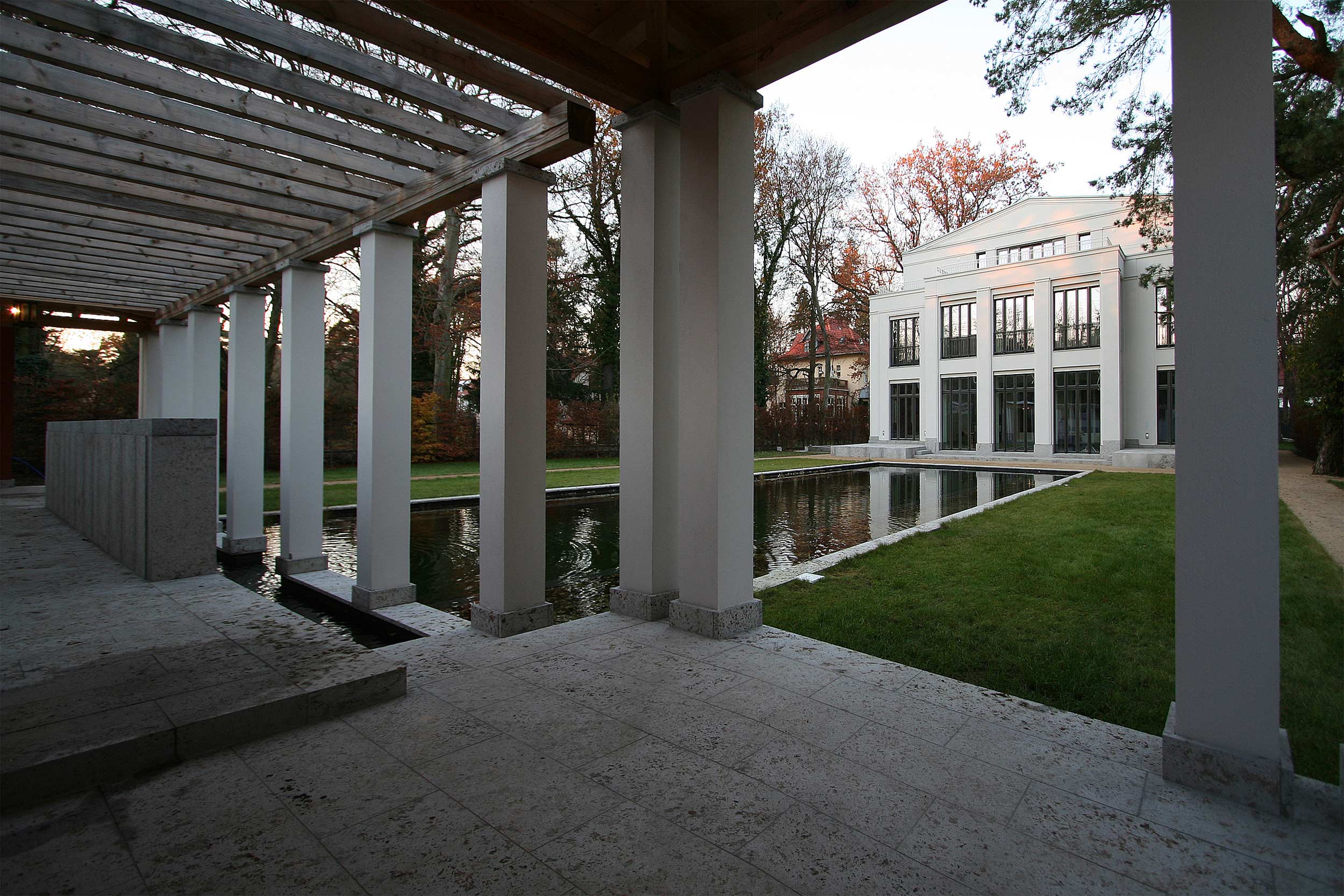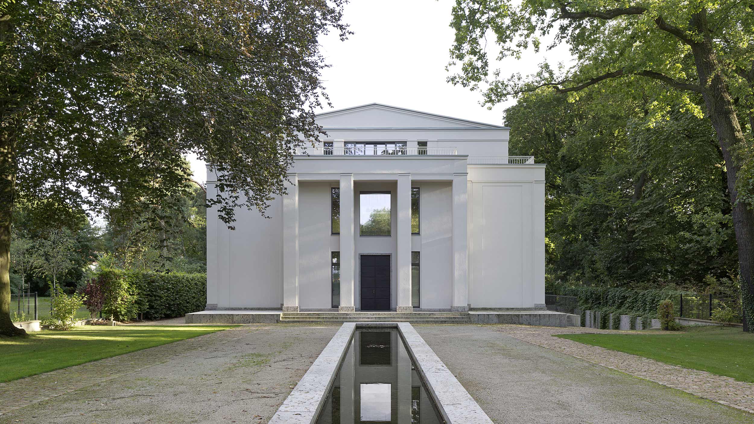 Für einen Liebhaber südländischer Wohnformen wurde der Neubau einer Villa im neoklassizistischen Stil in Potsdam errichtet. Antike Patio-Häuser mit einer inneren „Piazza“ als zentrale Lebenswelt lieferten das Sujet für den Neubau. In direkter Entsprechung zu dieser Typologie wurde der Villa ein Hof mit umlaufenden Galerien in den Obergeschossen einbeschrieben. Die Gegenwart des Himmels am Tag und in der Nacht entfaltet eine besondere eigene Magie im Inneren des Hauses.