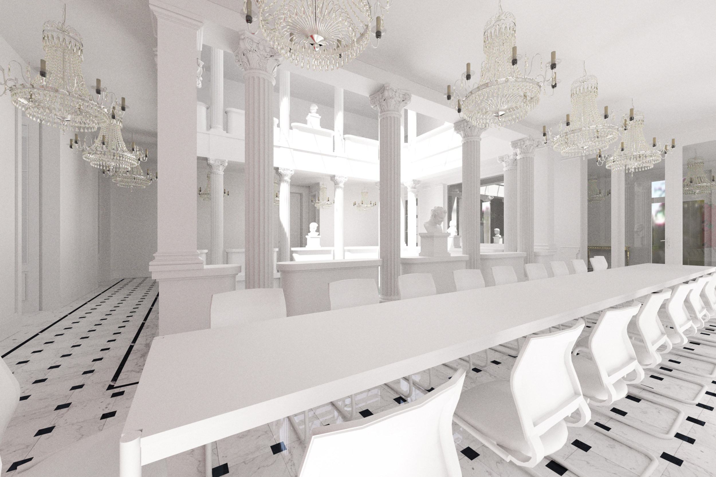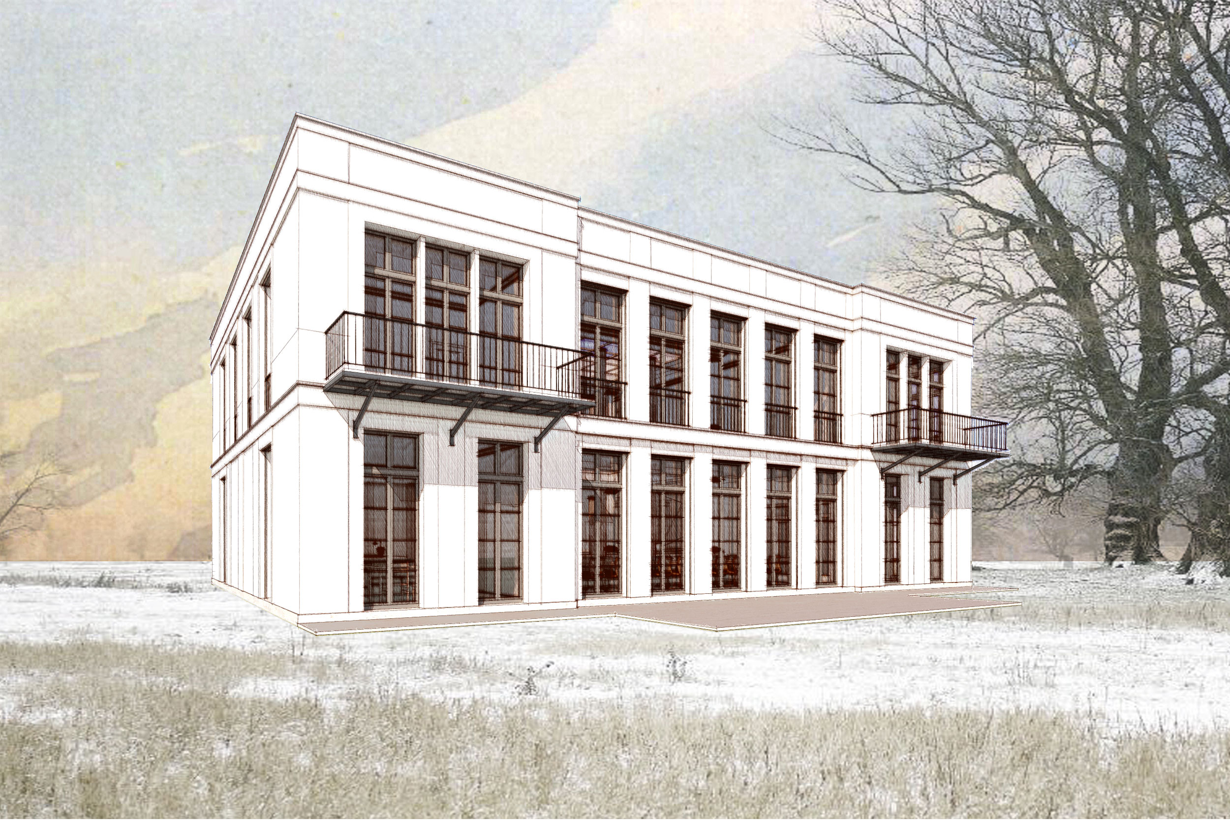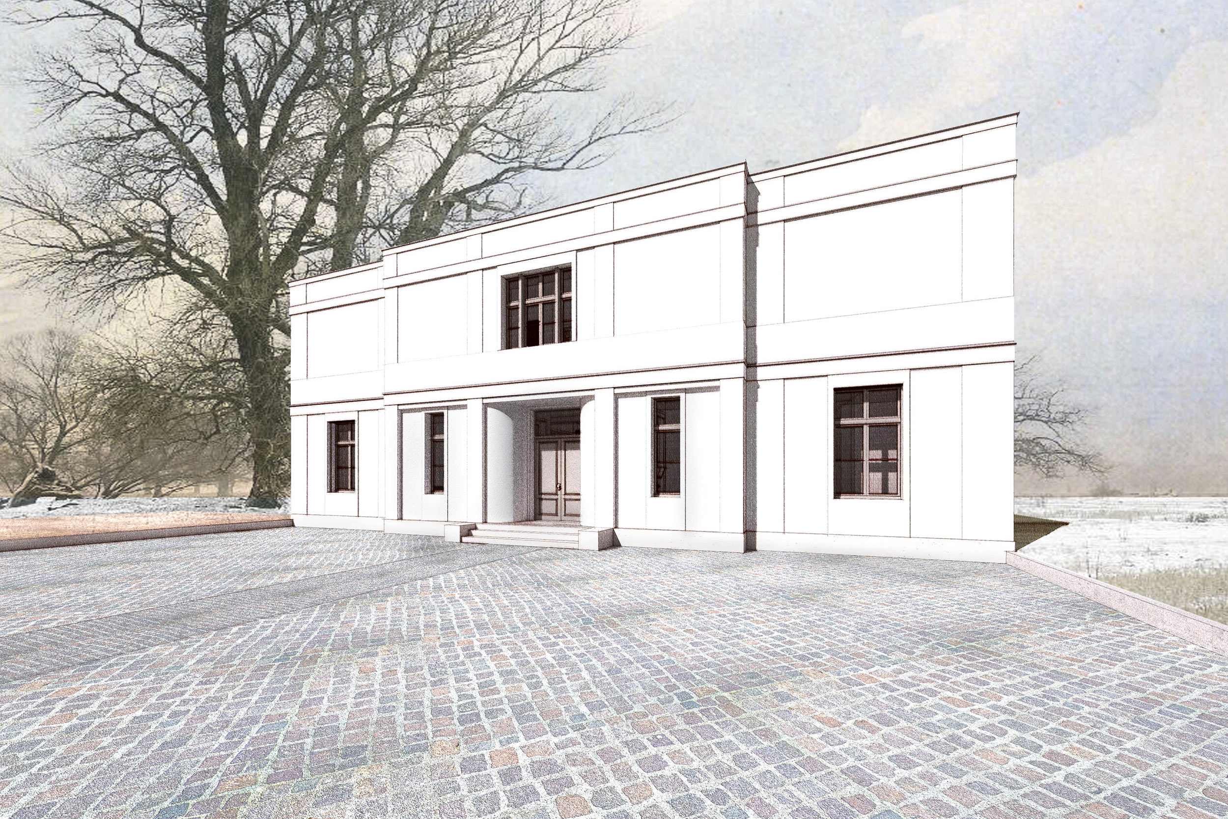 Die reduzierte Aussenansicht gibt bewusst keinen Hinweis auf die innere Raumorganisation. Loggien aus Säulen ummanteln über drei Geschosse den glasüberdeckten Innenhof. Von den Galerieebenen aus sind alle Nutzungen des Hauses zum Lichthof orientiert. Das Loggiamotiv widerspiegelt sich in der Aussenansicht zum Garten hin. PATIOVILLA – Landhaus mit Loggien zum Innenhof Kunde: o.A. Lage: Potsdam - Großglienicke Datum: 2014 Größe: 625qm