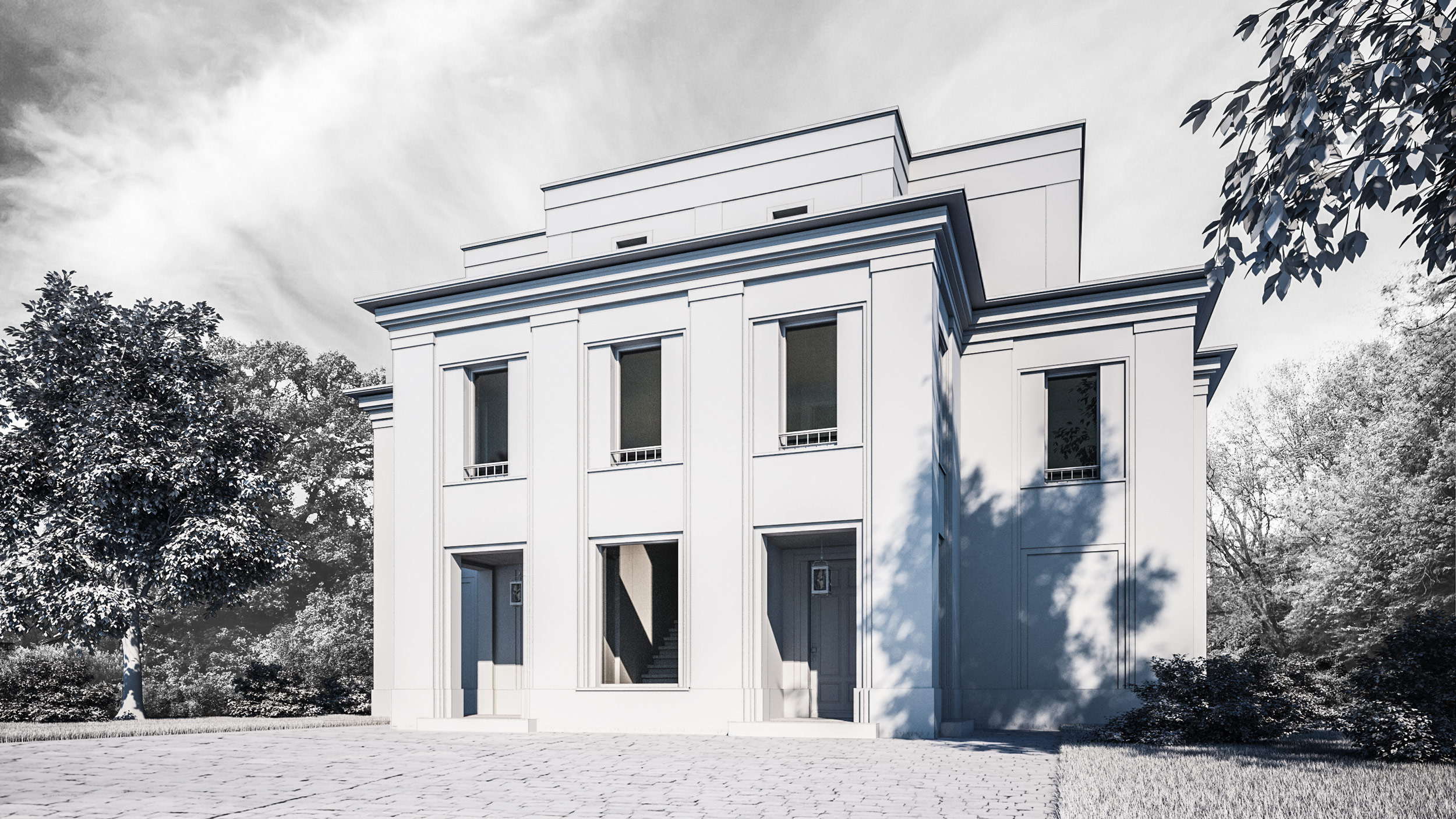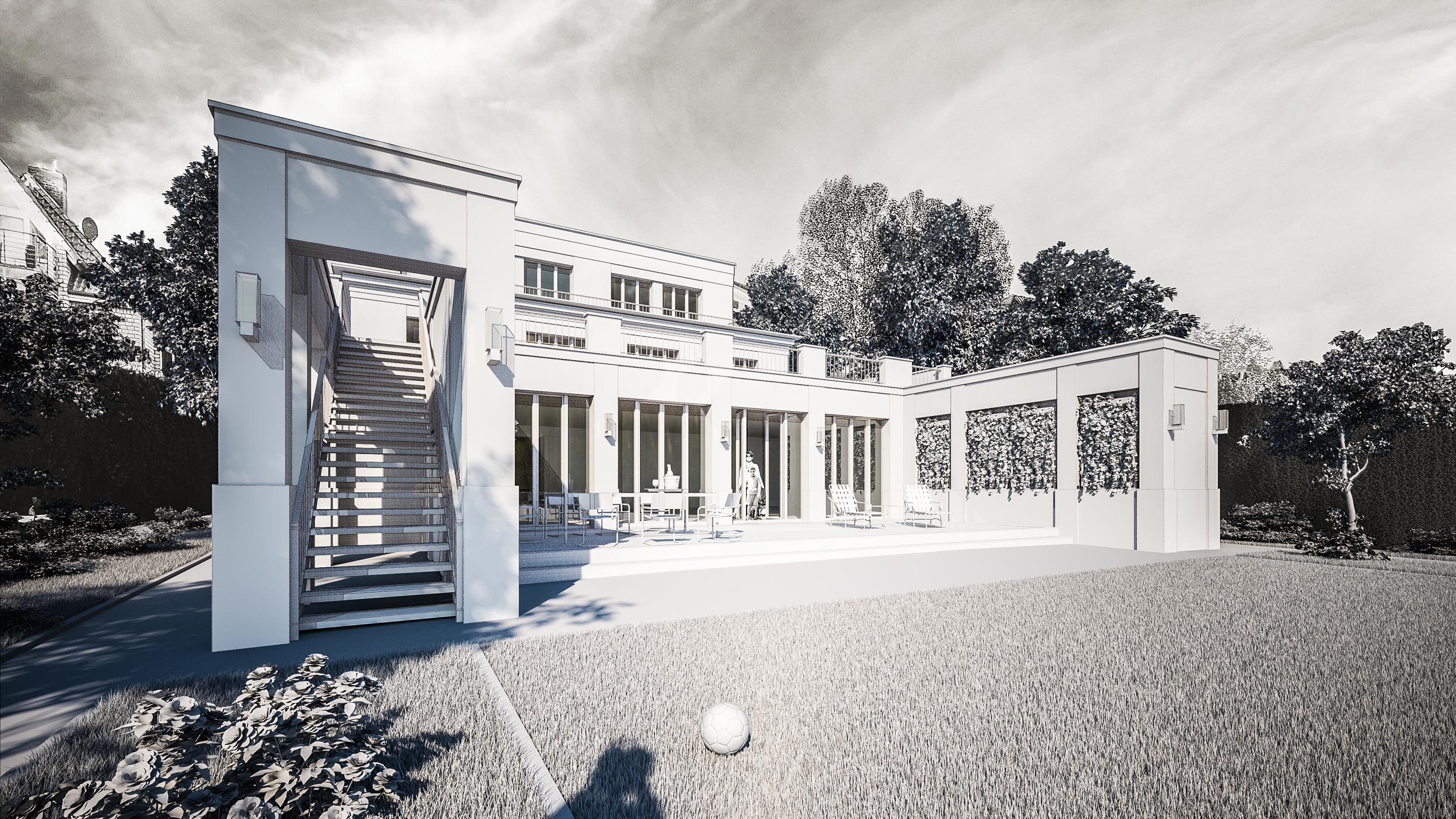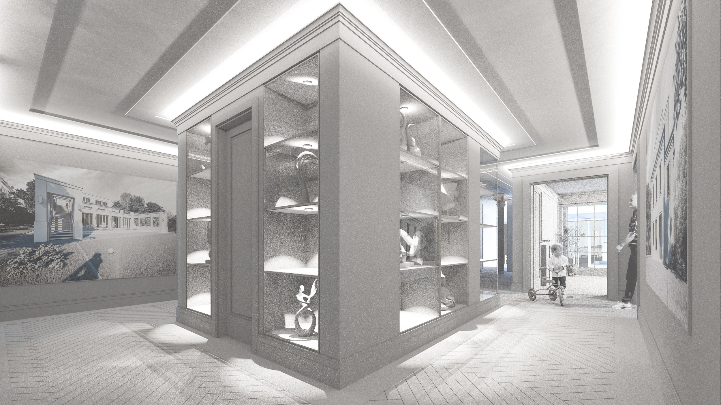 Drei Terrassenebenen eröffnen zum See weitläufige Aussichten auf die Müritz. Über halboffene Porches erfolgt der Zugang zu den Wohnungen im Eingangsportal. Drei Terrassenebenen eröffnen zum See weitläufige Aussichten auf die Müritz. Die großzügige Eingangshalle ist als Umgang mit Vitrineneinbauten gestaltet. SEETERRASSEN AN DER MÜRITZ – Redesign eines Mehrfamilienhauses in Seelage Kunde: o.A. Lage: Gerhart-Hauptmann-Allee 10a, Waren Datum: 2018 Größe: 654 QM